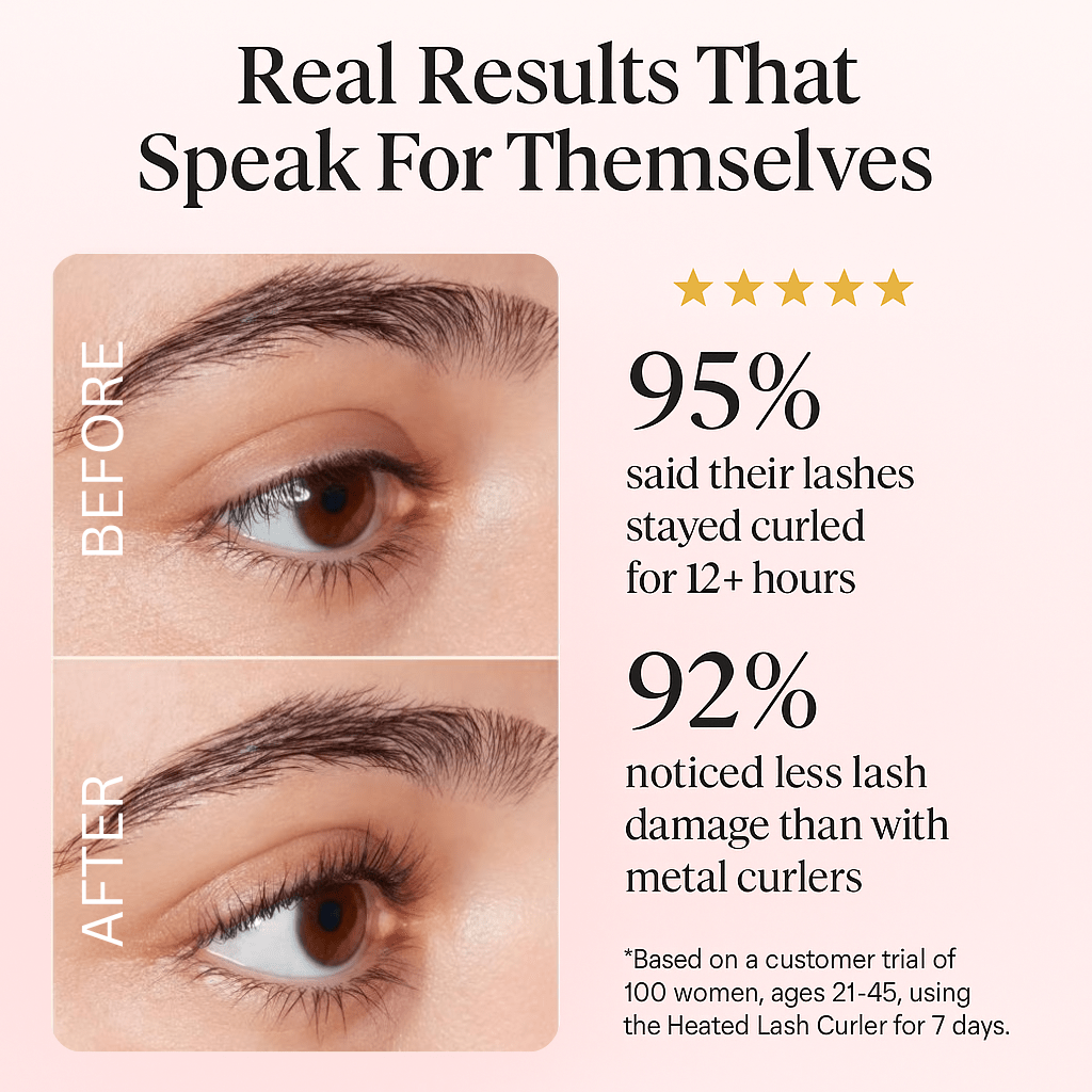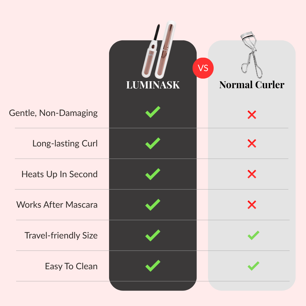 The LUMINASK Heated Curler works best on lashes that already respond to curling but don’t hold it for long with a traditional curler. If your lashes are moderately straight, you’ll see a stronger and longer-lasting lift. For very short or extremely stubborn lashes, results can be more subtle - but it’s still gentler and safer than constant pinching with metal curlers or the glue from falsies.